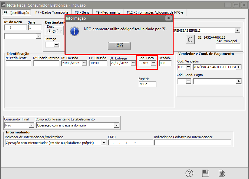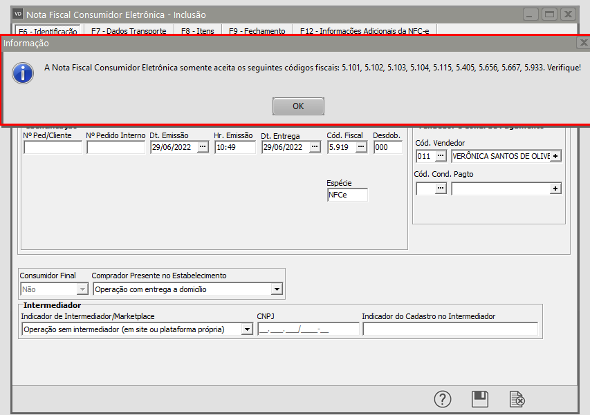 O Próprio sistema não permite a emissão de uma NFC-e com CFOP iniciado por número diferente de 5