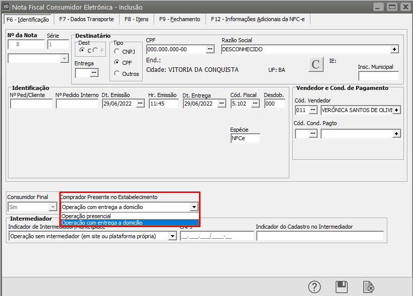 Verificar a informação cadastrada no campo Comprador Presente no Estabelecimento