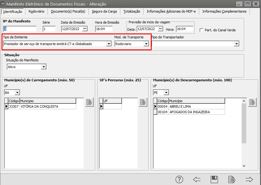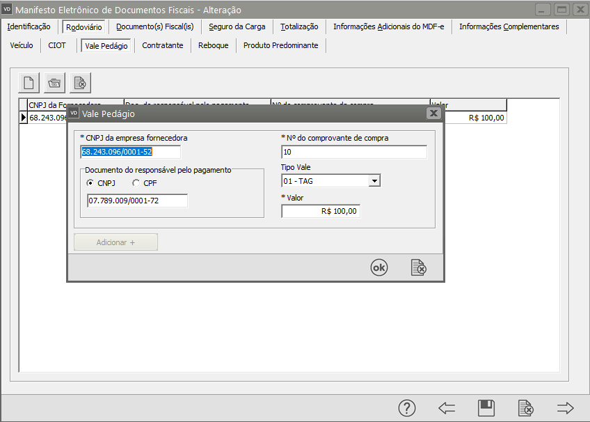 Acesse o menu Movimentação>MDF-e>Manutenção, pesquise pelo Manifesto e clique na seta Avança, em seguida edite o cadastro e verifique as informações cadastradas na aba Rodorviário, sub aba Vale Pedário