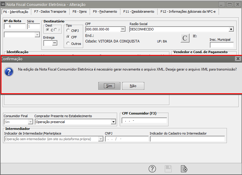 Em seguida salve novamente a NFC-e e o Sistema irá questionar se você deseja gerar um novo XML para Transmissão, clique em SIM.