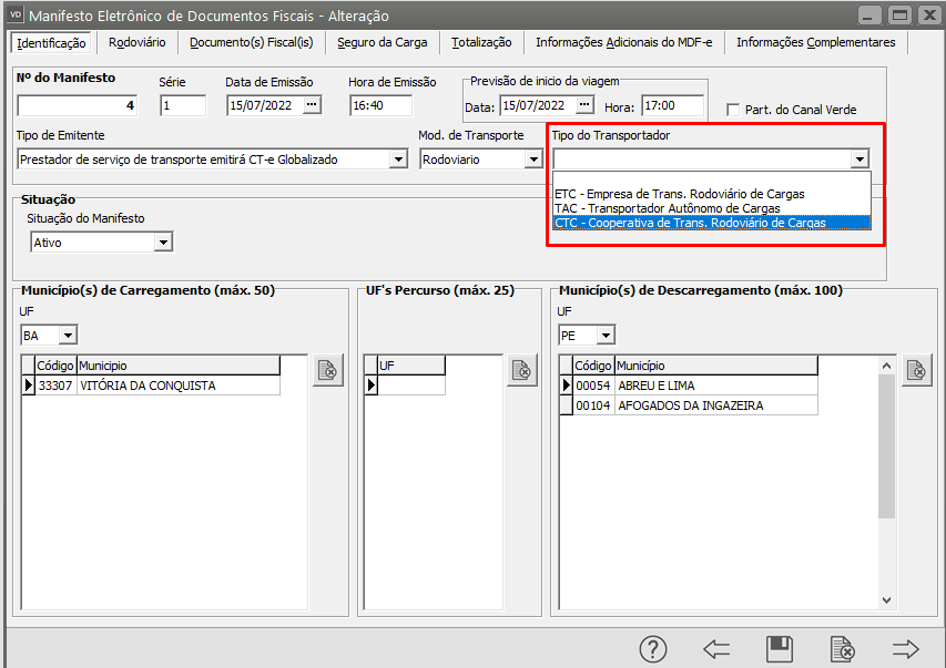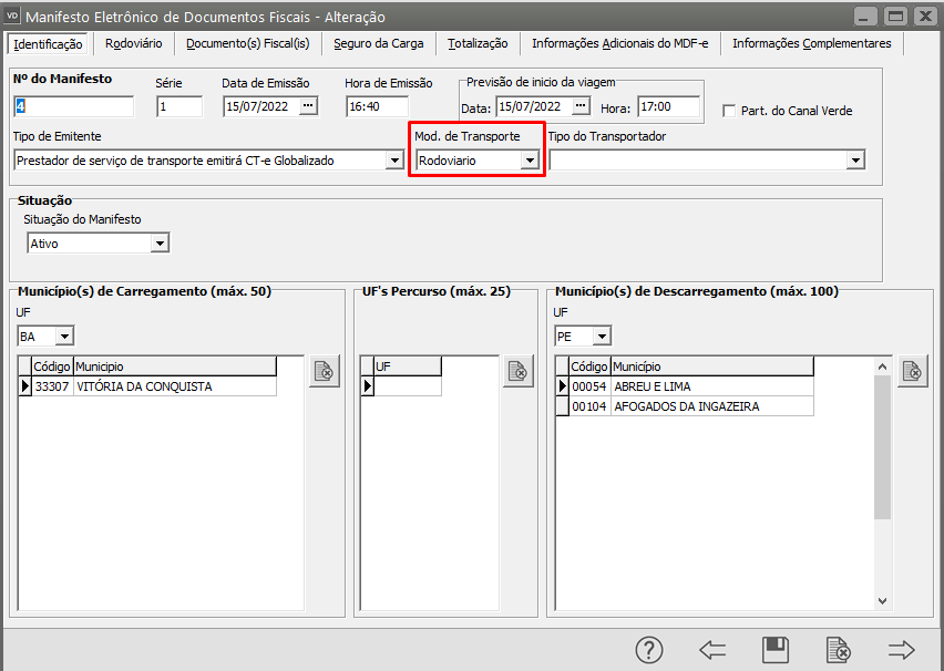 Acesse o menu Movimentação>MDF-e>Manutenção, pesquise pelo Manifesto e clique na seta Avança, em seguida edite o cadastro.