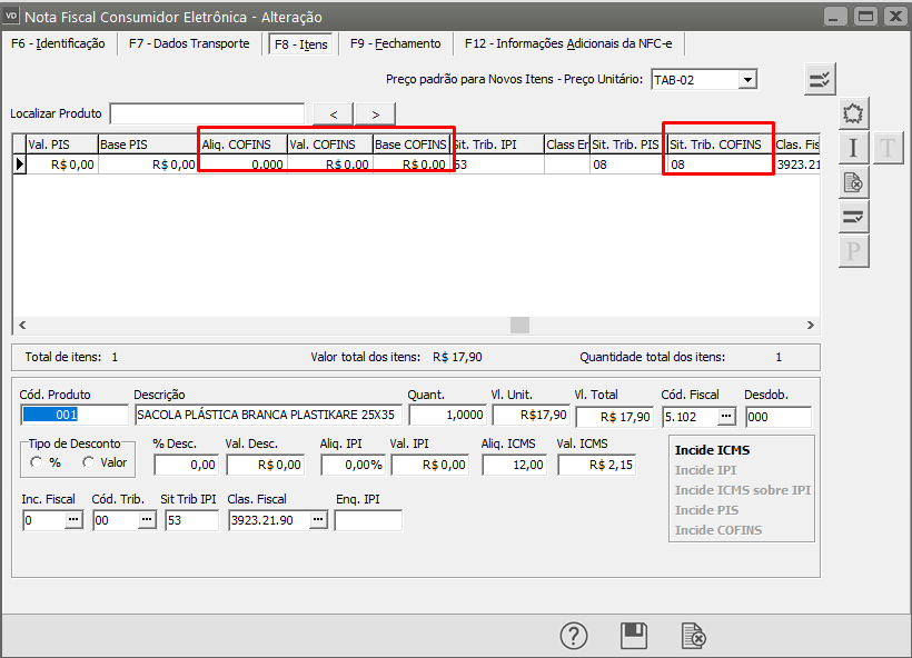 Corrija as informações dos campos Situação Tributária do Cofins, Alíquota Cofins, Base Cofins e Valor Cofins.