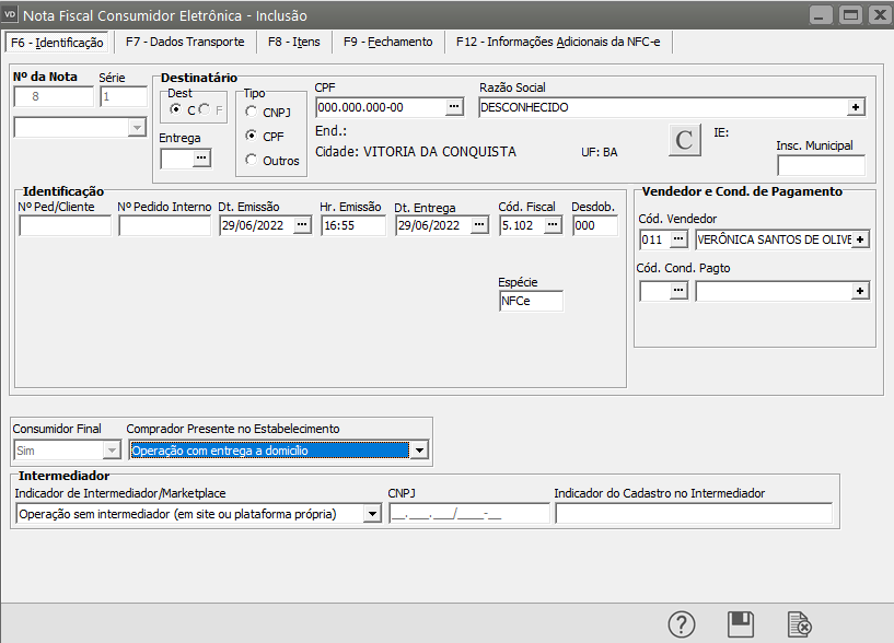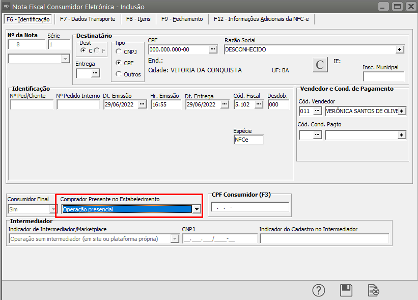 Verifique a informação cadastrada no Comprador Presente no Estabelecimento está coerente com a informação cadastrada na aba Dados Transporte.
