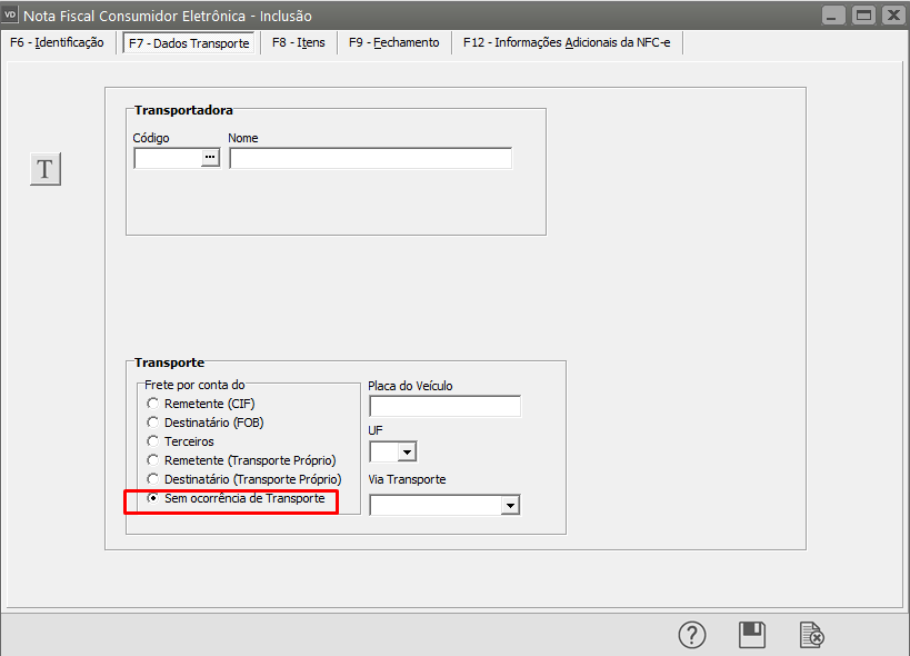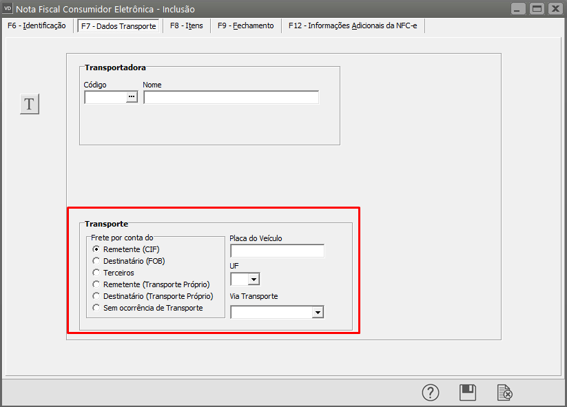 Informe coerentemente a aba Dados Transporte, de acordo com a informação do Comprador Presente no Estabelecimento