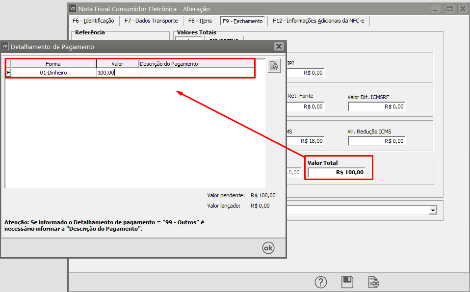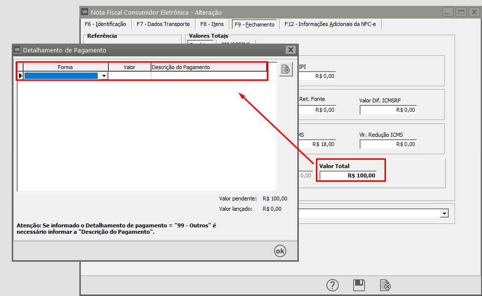 Descrição: NFC-e deve possuir o grupo de Formas de Pagamento