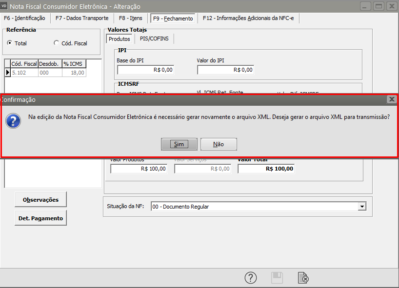 Em seguida salve a NFC-e e o Sistema irá questionar se você deseja gerar um novo XML para transmissão, clique em SIM.