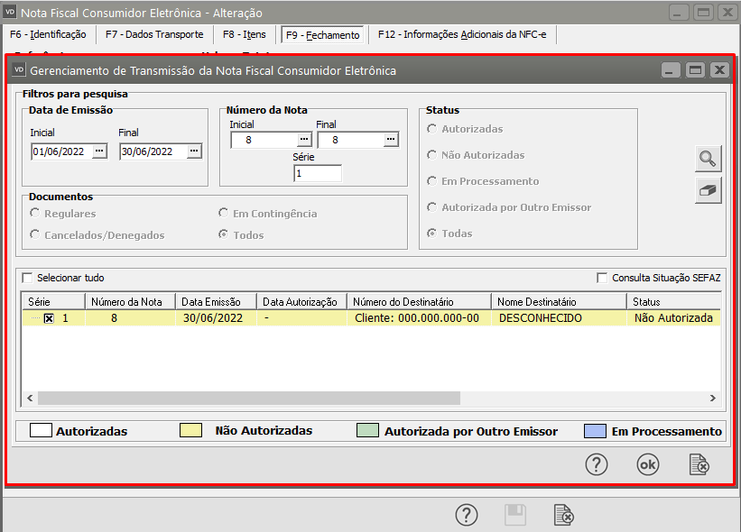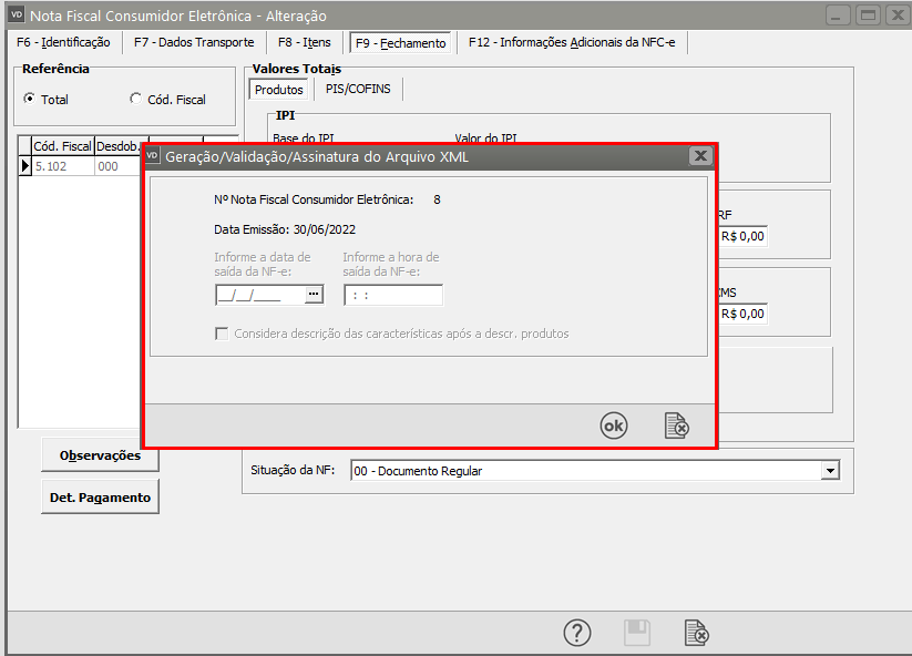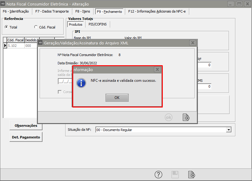 Se todas as informações estiverem corretamente cadastradas a NFC-e será assinada e validada com sucesso.