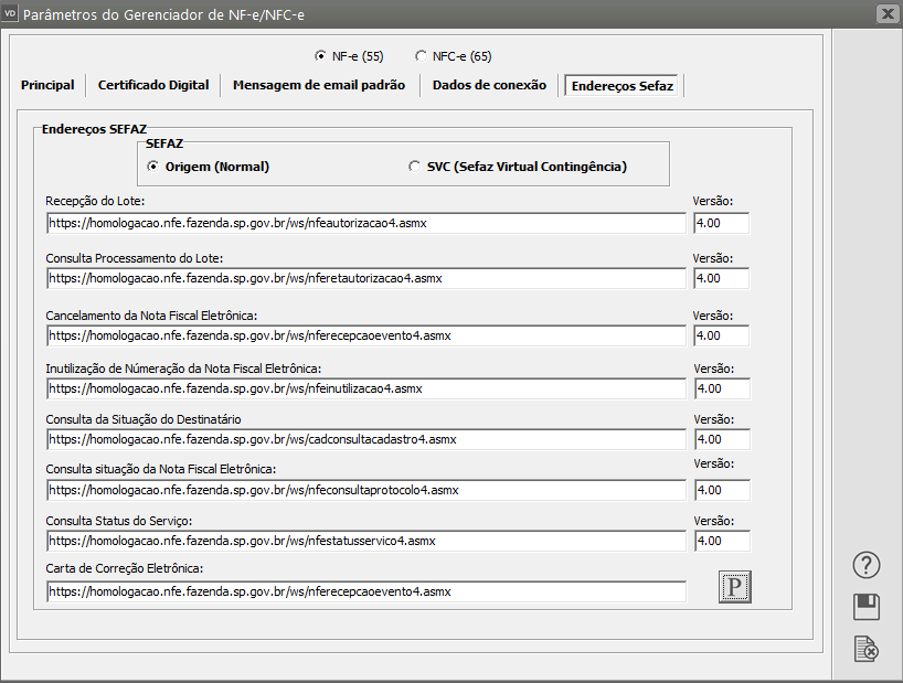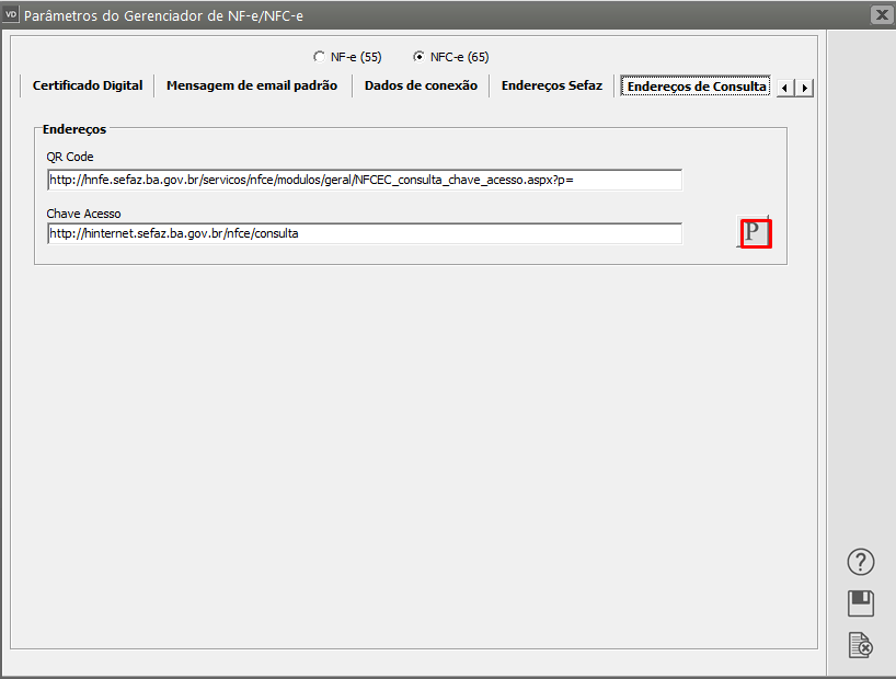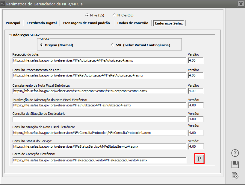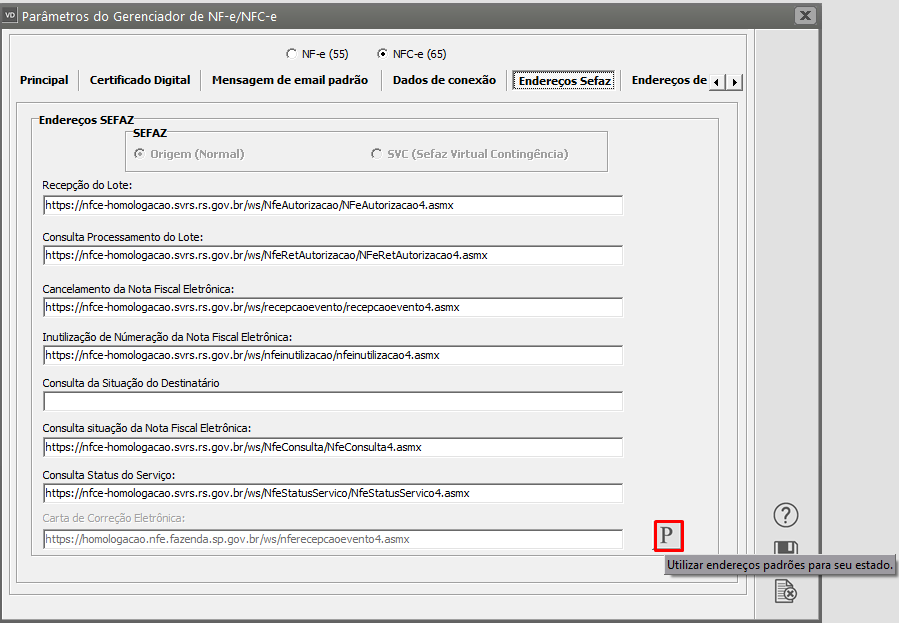Em seguida acesse a aba Endereços Sefaz, clique no botão com a letra P