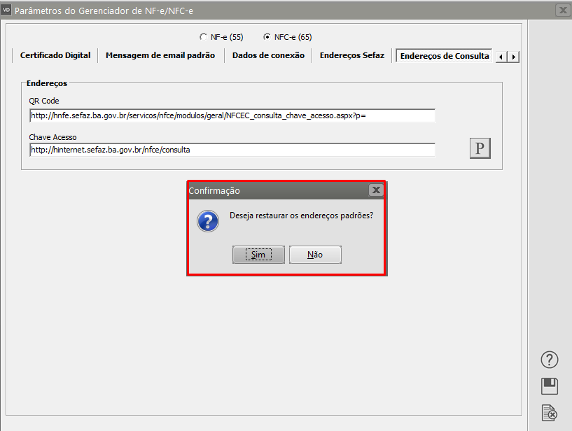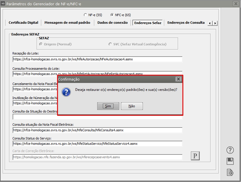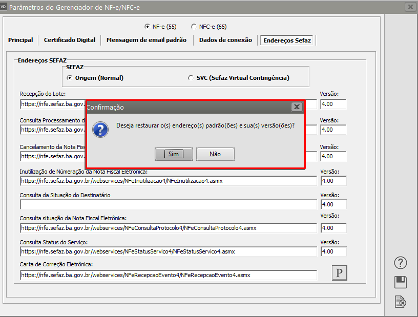 O Sistema irá questionar se você deseja restaurar os endereços padrões e suas versões, clique em SIM.