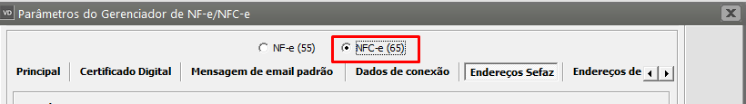 2) Para NFC-e, defina na parte superior central da tela NFC-e(65)