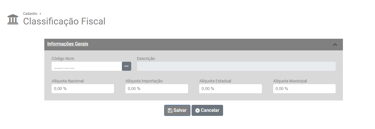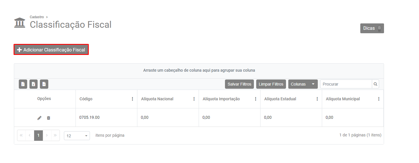 Clique em Adicionar Classificação Fiscal