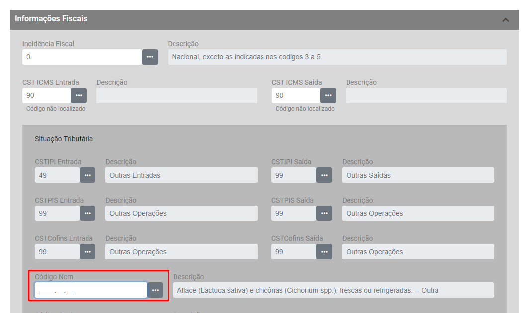 Descrição: Informado NCM inexistente