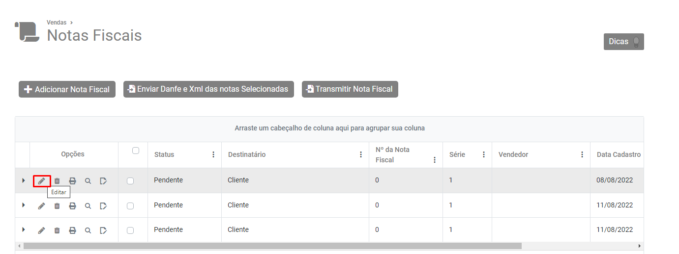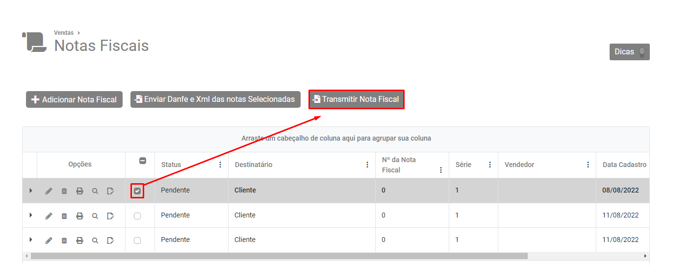 Em seguida, selecione a NFe e clique no botão Transmitir Nota Fiscal.