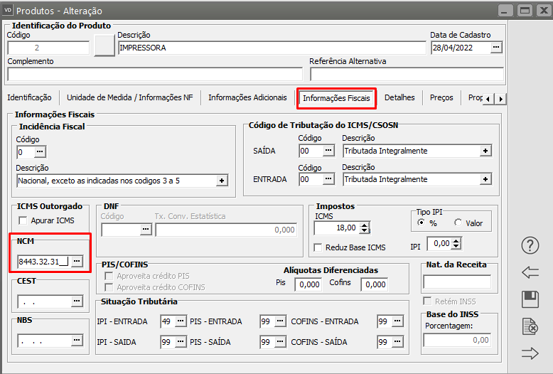 Acesse a aba Informações Fiscais e informe o NCM comcorreto para o produto