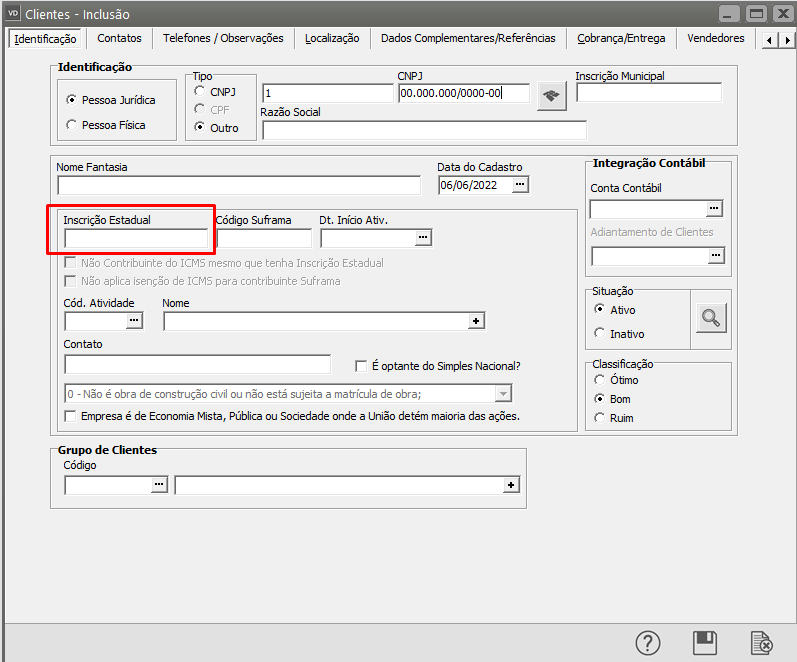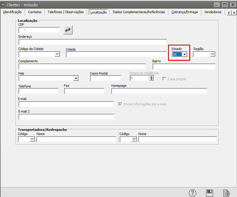 2 - Em seguida acesse a aba Localização e verifique se o Estado informado para o cliente é XX