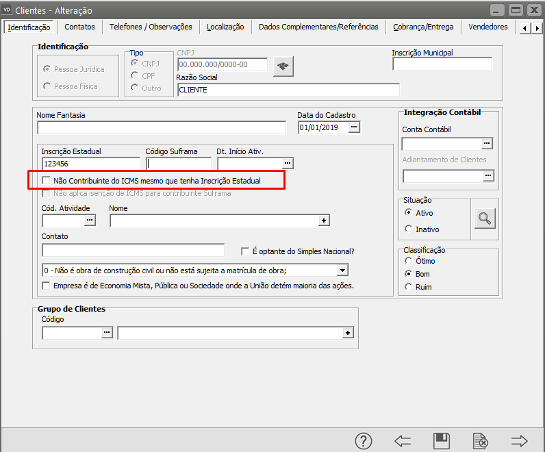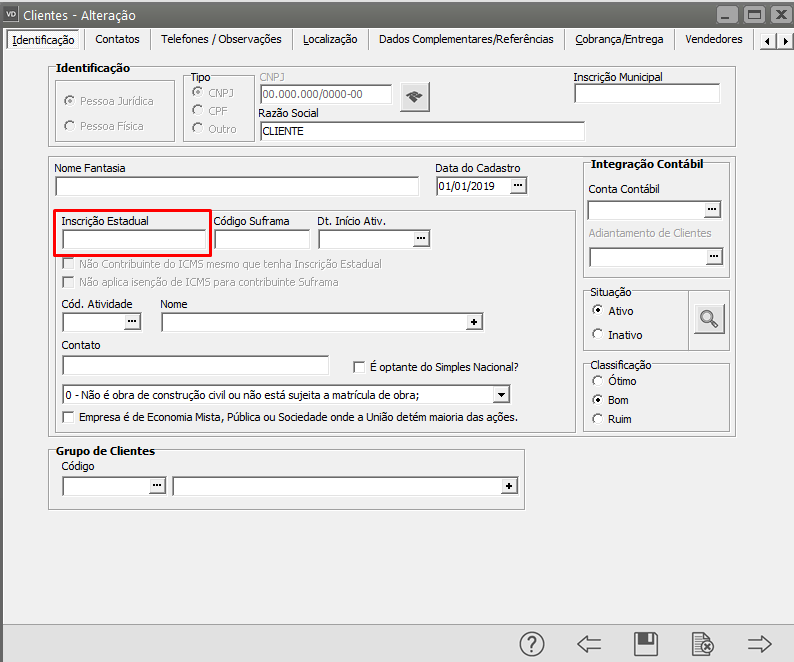 Em caso afirmativo apague a informação e caso o cliente não possua IE deixe o campo em branco, caso o cliente seja contribuinte do ICMS informe o número da Inscrição Estadual do mesmo.