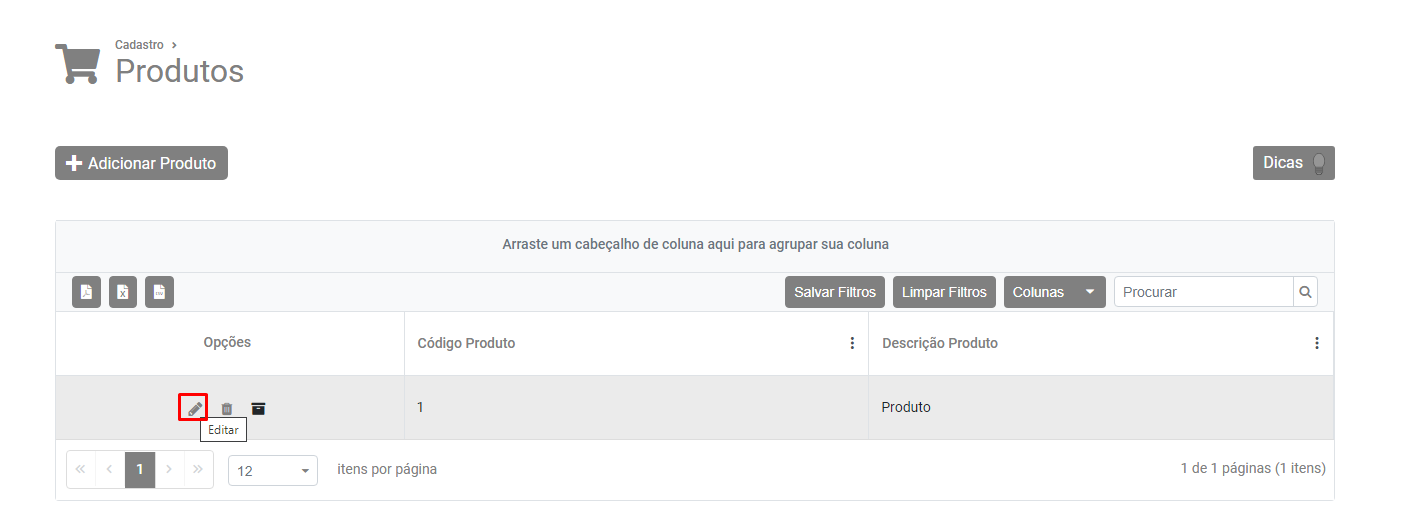 Pesquise pelo produto constante na NFe e clique no botão para editar o cadastro do mesmo.