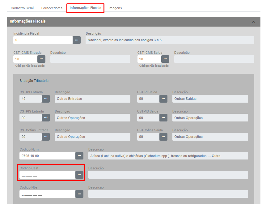 Em seguida acesse a aba Informações Fiscais e informe o CEST do produto.
