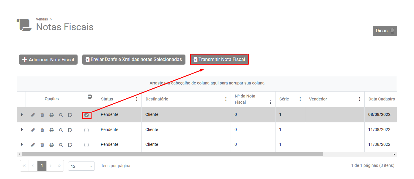 Agora, selecione a nota e clique no botão Transmitir Nota Fiscal.