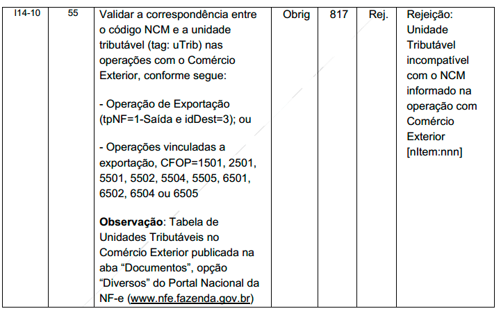 Quando for emitida uma NF-e com Unidade Tributável (uTrib) incompatível com a NCM (Nomenclatura Comum do Mercosul) informada em Operação de Exportação (tpNF = 1 e idDest = 3) ou com o CFOP igual a 1501, 2501, 5501, 5502, 5504, 5505, 6501, 6502, 6504 ou 6505, será retornado a rejeição: "817 - Unidade Tributável incompatível com o NCM informado na operação com Comércio Exterior".