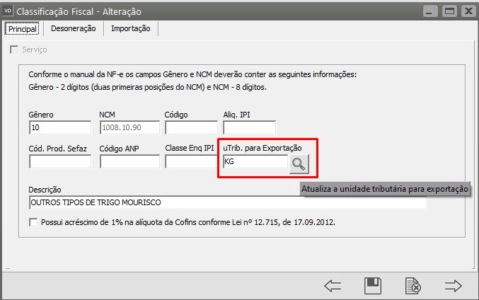 Clique no botão Atualiza a unidade tributária para exportação, o Sistema irá cadastrar automaticamente a Unidade de Medida para o Produto