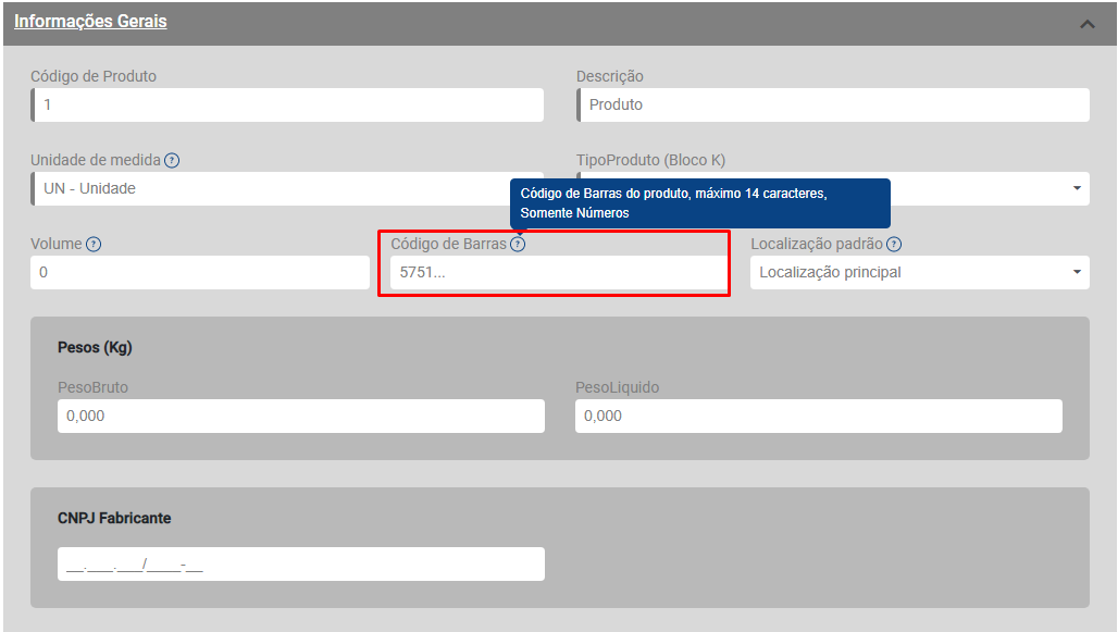 Em seguida informe o Código de Barras para esse produto.