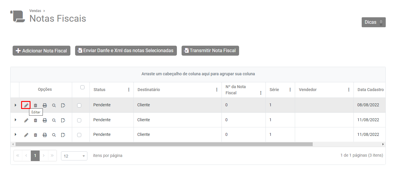 Pesquise pela NFe e faça a edição da mesma