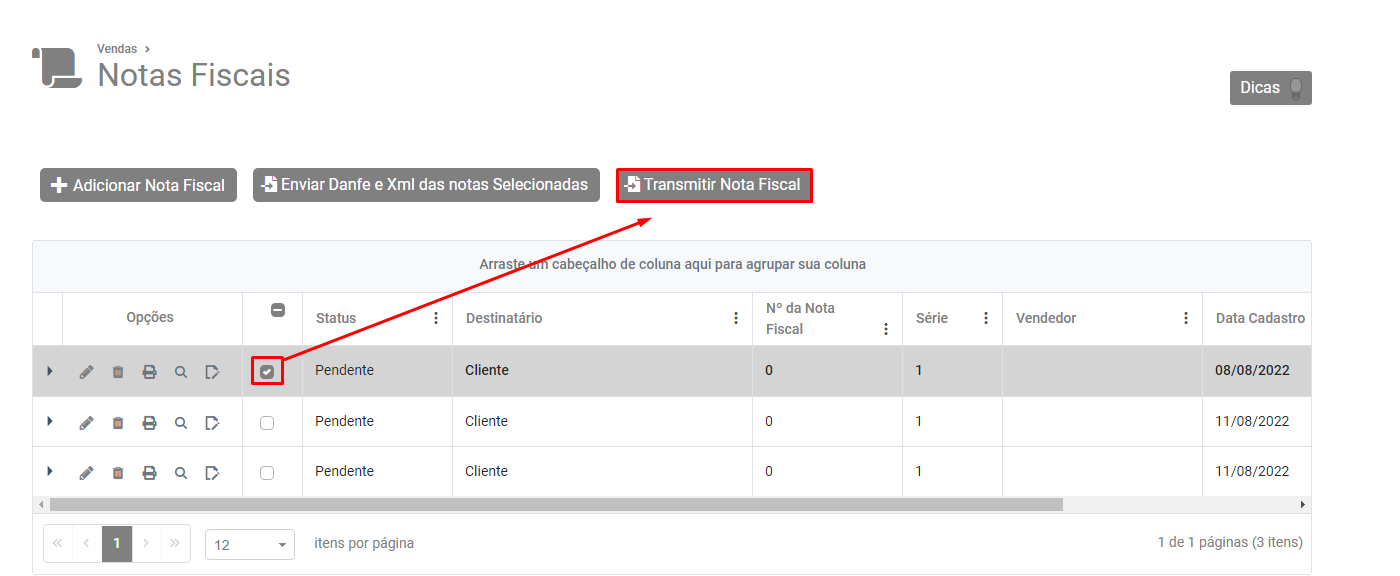 Selecione a nota e clique no botão Transmitir Nota Fiscal