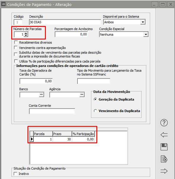 Verifique qual é a condição de pagamento informada na NF-e e em seguida acesse o menu Manutenção>Tabelas>Condições de Pagamento>Manutenção, pesquise pela condição de pagamento e clique na seta Avança, edite a Condição de Pagamento.