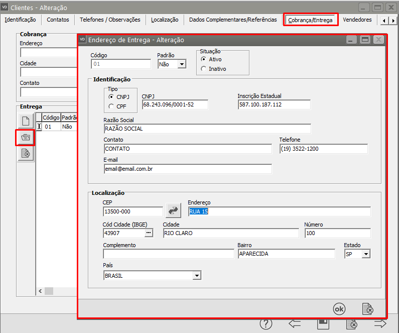 Em seguida acesse a aba Cobrança/Entrega e confirme as informações digitadas nos endereços, faça as correções que forem necessárias, clique em OK e salve o cadastro do cliente.