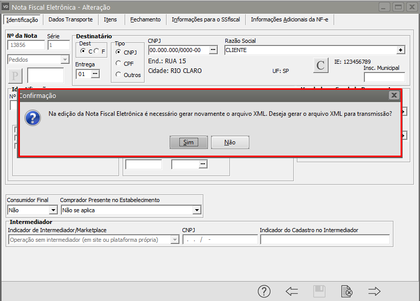 Em seguida acesse o menu Movimentação>Nota Fiscal Eletrônica>Manutenção, pesquise pela NF-e e clique na seta Avança, edite a Nota Fiscal e busque pelo cliente novamente (para que o Sistema atualize as informações que foram alteradas em seu cadastro), salve a NF-e e o Sistema irá questionar se você deseja gerar um novo XML para transmissão, clique em SIM.