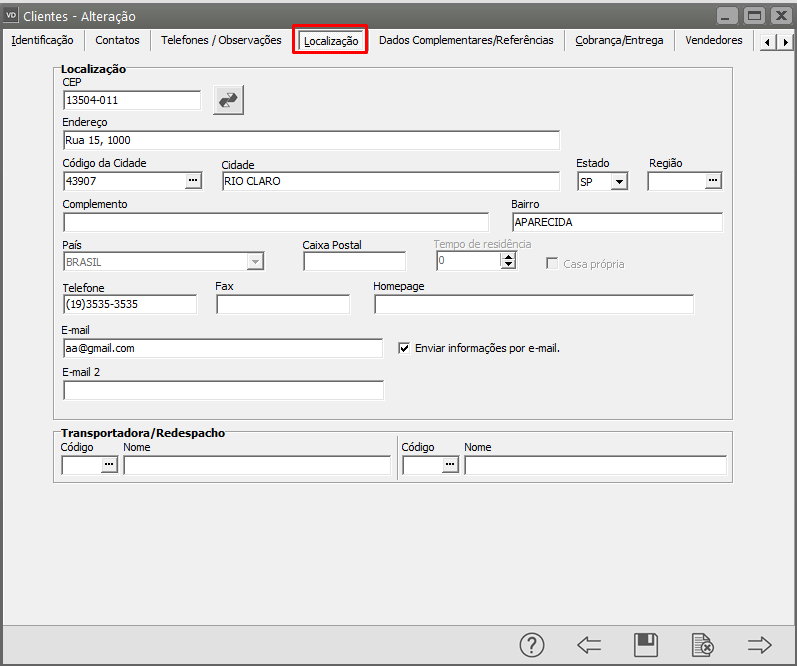 Confira acesse a aba Localização, confiratodas as informações ecadastradas façno Campo Endereço (de todos os endereços cadastrados para o cliente, padrão, entrega, cobrança, faturamento, outros, etc)