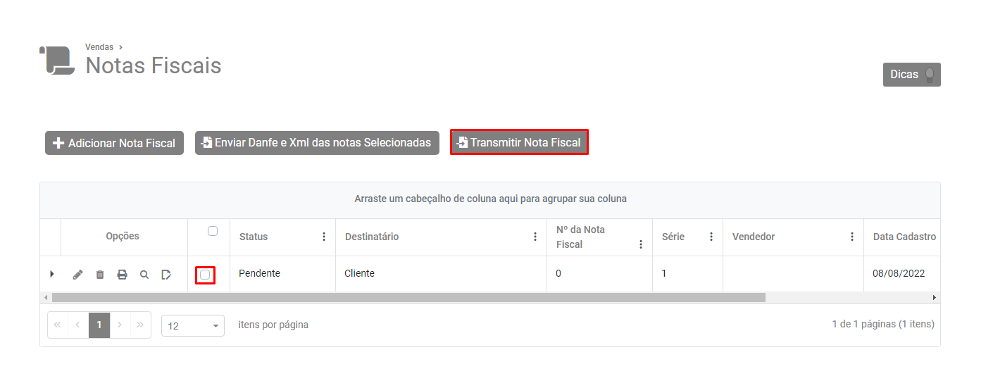 Selecione a nota no Grid e clique no botão Transmitir Nota Fiscal