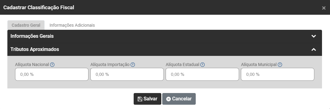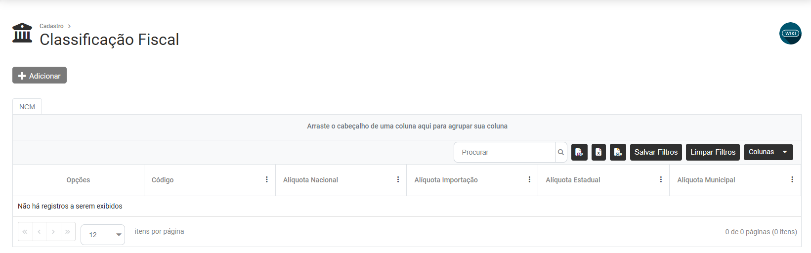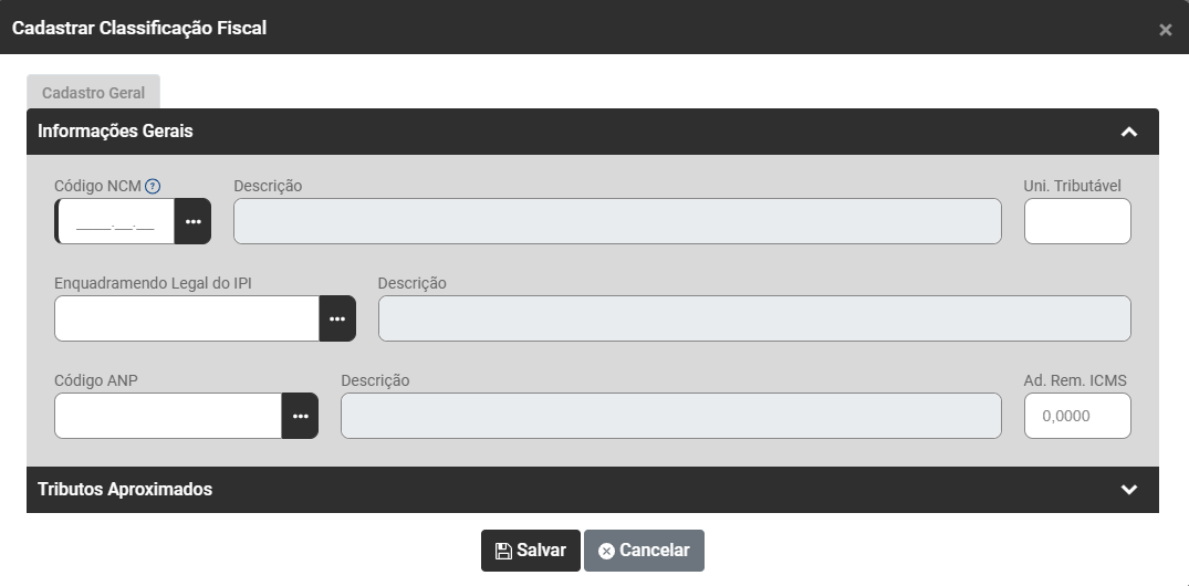 Será apresentada a tela Cadastrar Classificação Fiscal - NCM