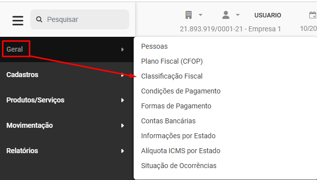 Para Cadastrar a Classificação Fiscal (NCM Nomenclatura do Mercosul) ou a (NBS-Nomenclatura Brasileira de Serviços) dos produtos e serviços de sua empresa, acesse o menu Geral>Classificação Fiscal