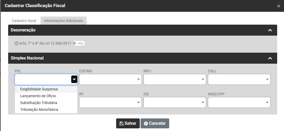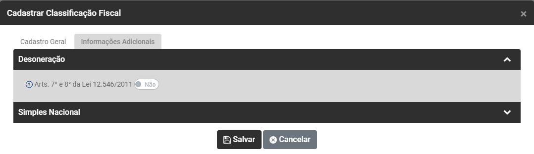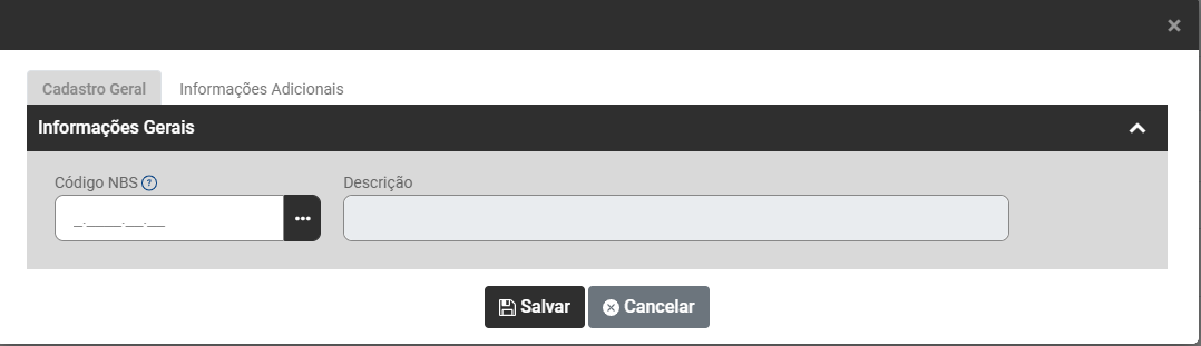 Será apresentada a tela Cadastrar Classificação Fiscal - NBS