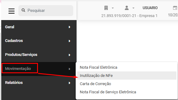 Para cadastrar a Inutilização da Nota Fiscal Eletrônica acesse o menu Movimentação>Inutilização de NFe