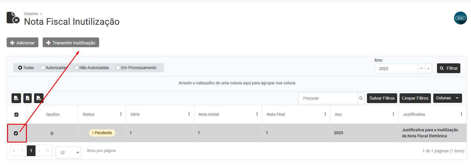 Se você não realizou a transmissão da inutilização no momento do cadastro da mesma você poderá realizar a transmissão da Inutilização para a SEFAZ através do Grid de informações, você deverá assinalar a Inutilização e em seguida clicar no botão Transmitir Inutilização