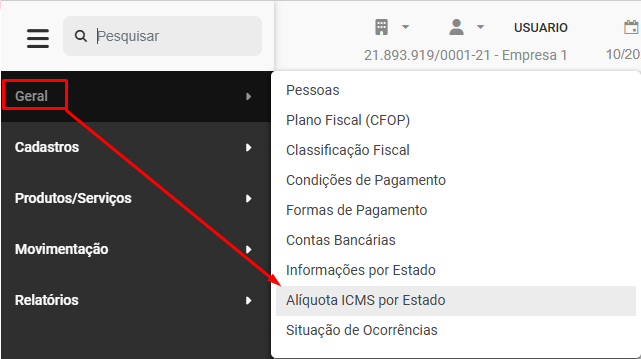 Para cadastrar as Alíquotas de ICMS por Estado, acesse o menu Geral>Alíquotas ICMS por Estado