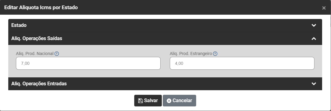 Cadastro das Alíquotas de ICMS por Estado