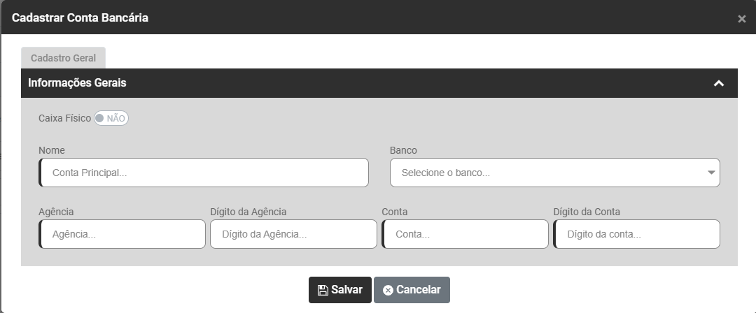Ao acionar o Botão, o Sistema irá apresentar a tela para que você cadastre a Conta Bancário, contendo os seguintes campos