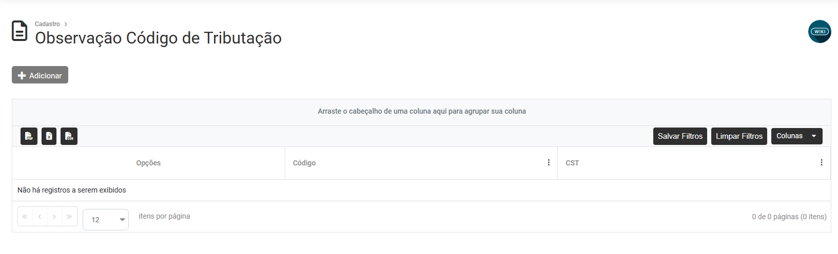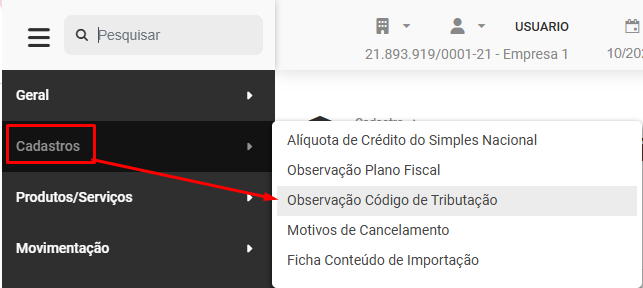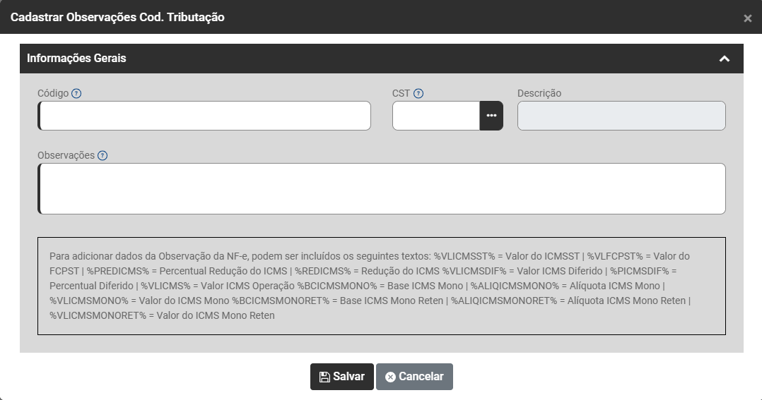 Cadastro das Observações do Código de Tributação