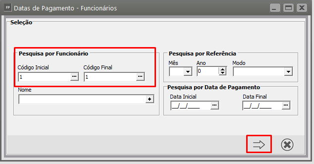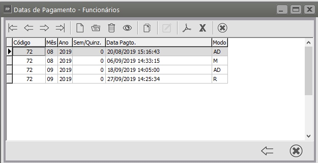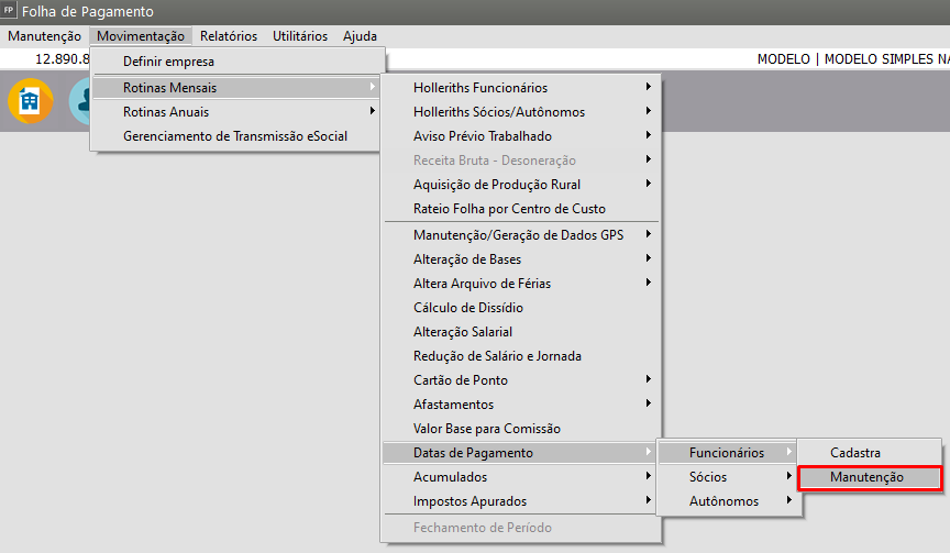 Correção: Acesse o menu Movimentação > Rotinas Mensais > Datas de Pagamento > Funcionários > Manutenção,.