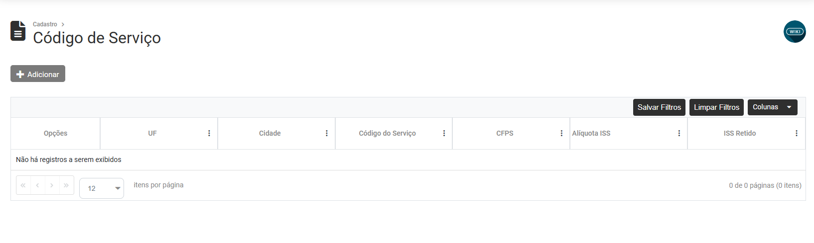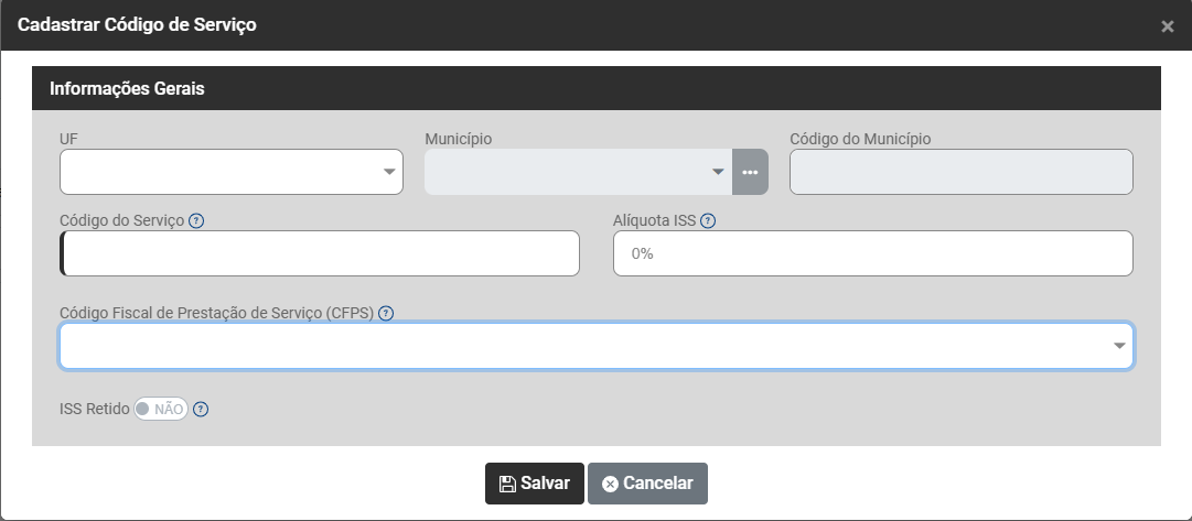 Ao acionar o botão Adicionar será apresentada a tela para que você Cadastre o Código de Serviço