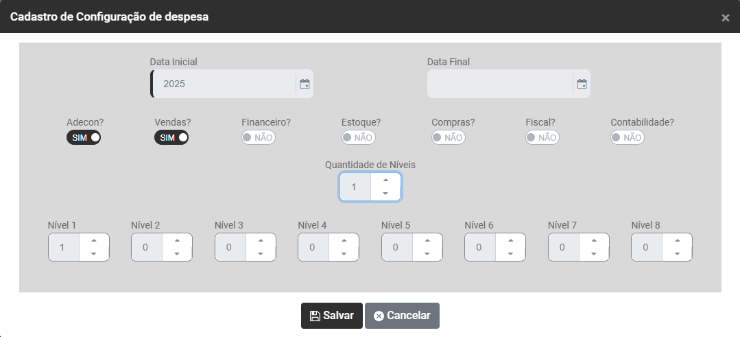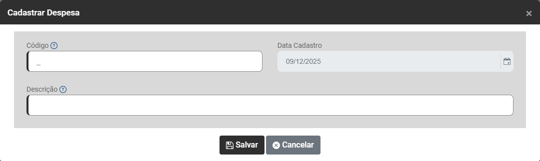 - Data de Cadastro da Despesa - O Sistema não permitirá o uso desta despesa em data anterior a definida neste campo