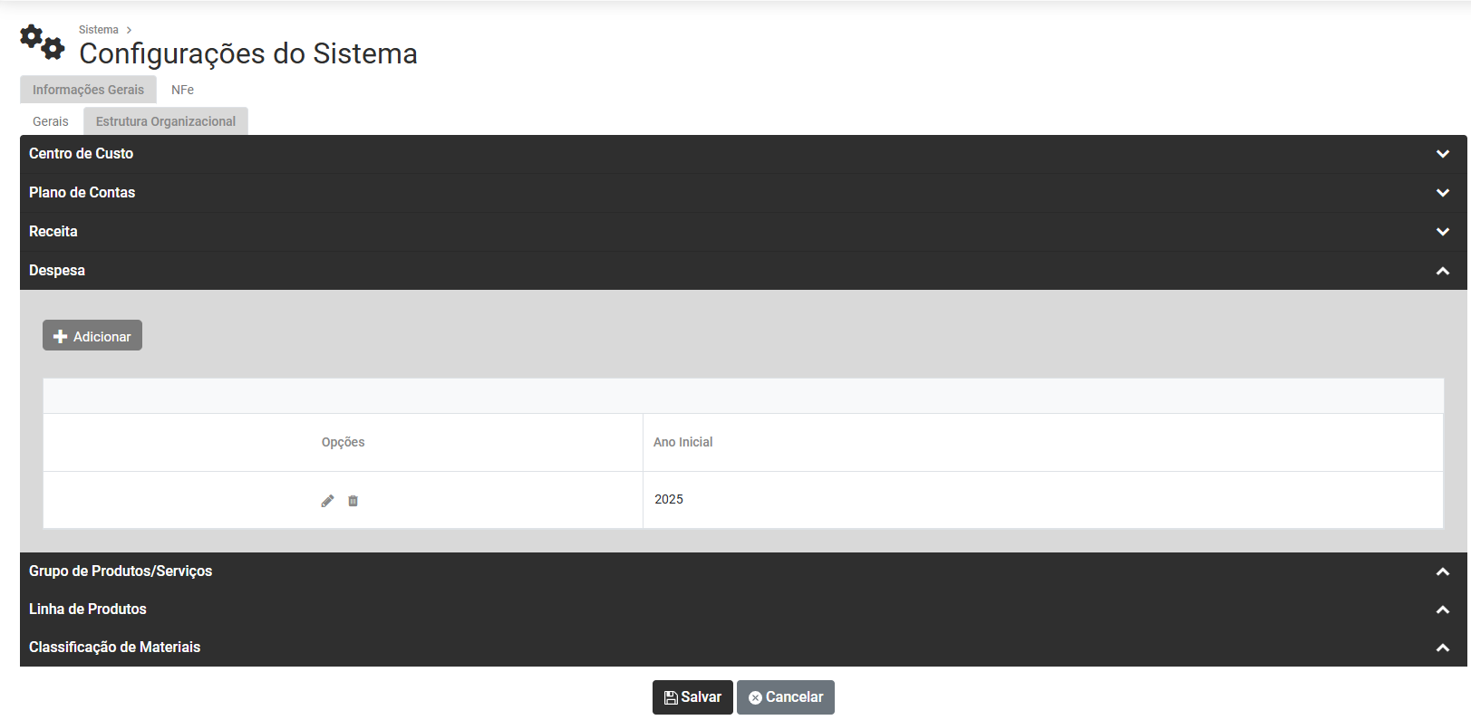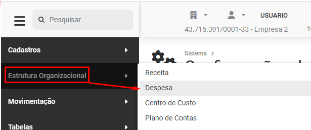 Para cadastrar as Despesas acesse o menu Estrutura Organizacional>Despesa