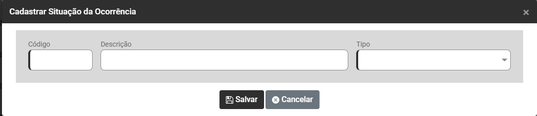 Se você clicar no Botão Adicionar será apresentada a tela contendo o Código, Descrição e Tipo da Ocorrência