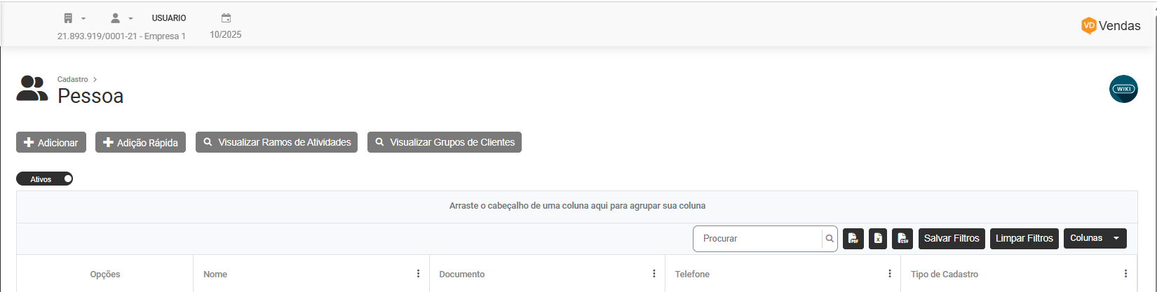 Na parte superior da Tela Você encontrará 4 botões mais a opção para mostrar apenas as Pessoas Ativas ou Inativas