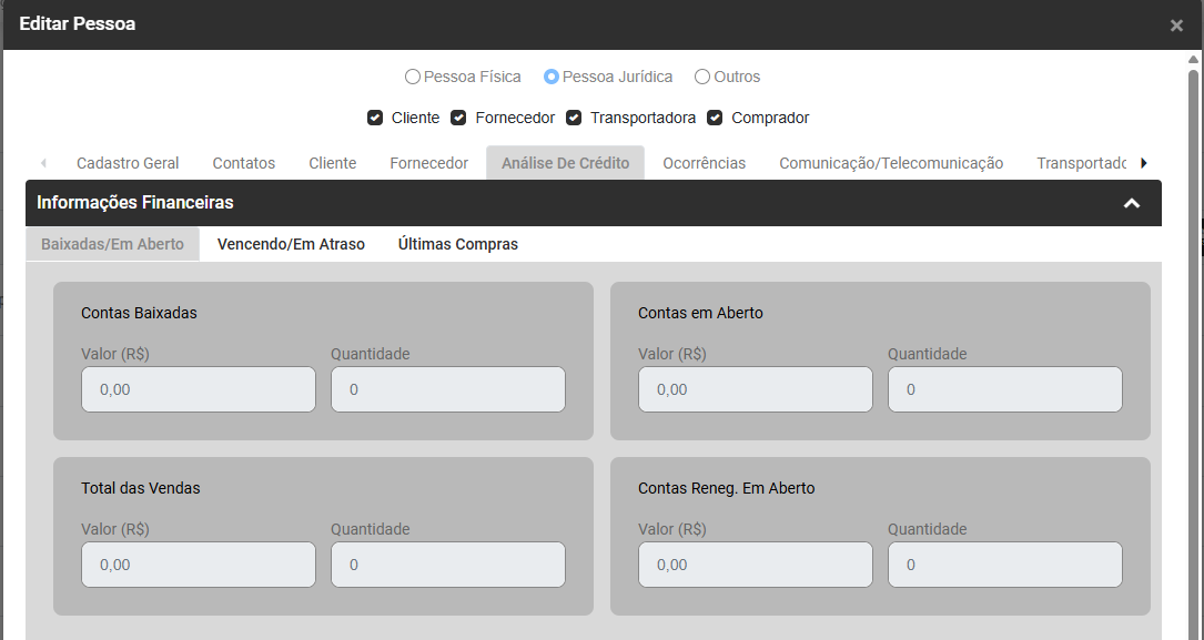 3) ABA CLIENTES - será apresentada se você definiu que a Pessoa é Cliente