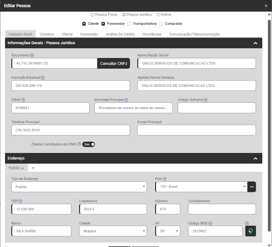 4) ABA FORNECEDOR - será apresentada se você definiu que a Pessoa é Fornecedor